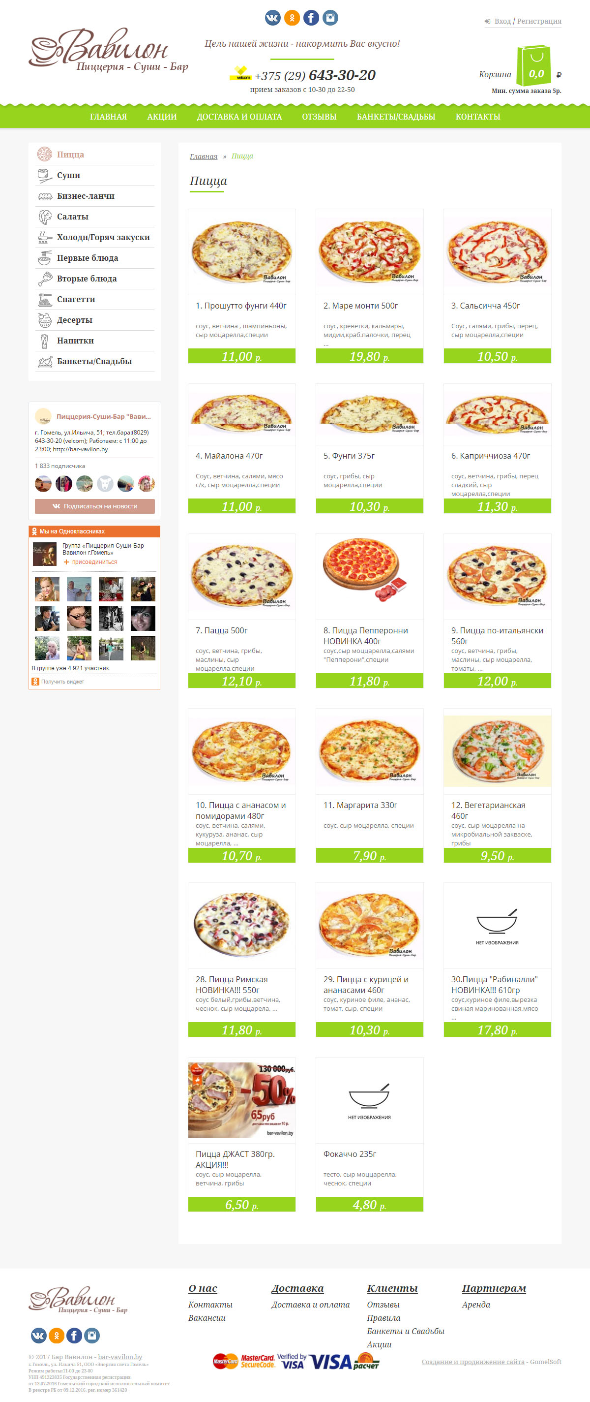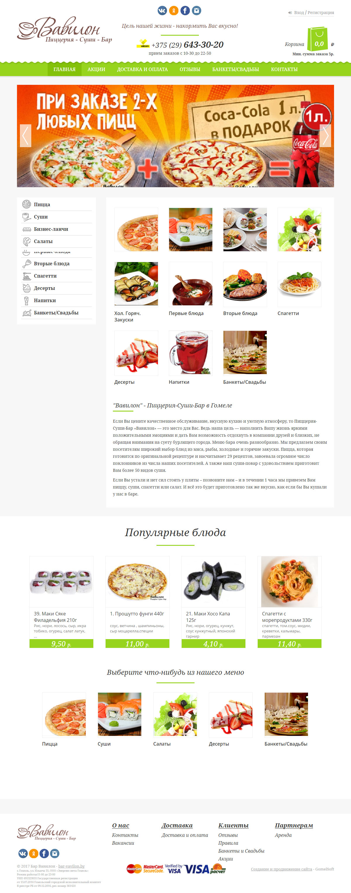 "Вавилон" - это Пиццерия-Суши-Бар в Гомеле. Если вы цените уютную атмосферу, вкусную кухню, то это место для вас. Слоган и цель данного заведения "Мы накормим Вам вкусно!" Выбор меню здесь довольно большой, всякий гурман будет доволен. А теперь, благодаря нам, у этого заведения еще и новенький удобный сайт, который позволит сделать заказ Онлайн, оплатить его картой Visa/MasterCard. И уже в течение короткого времени вам привезут горячий заказ :)